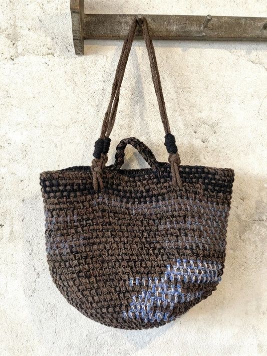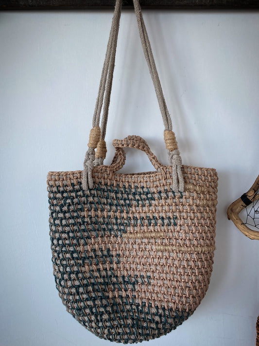 Cada pieza nace de ese recuerdo: está tejida con calma, sin prisa, con fibras naturales como algodón y yute. Ninguna es igual a otra — su forma y color se deciden mientras la hago.