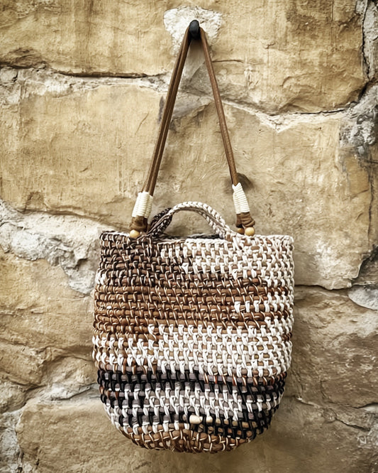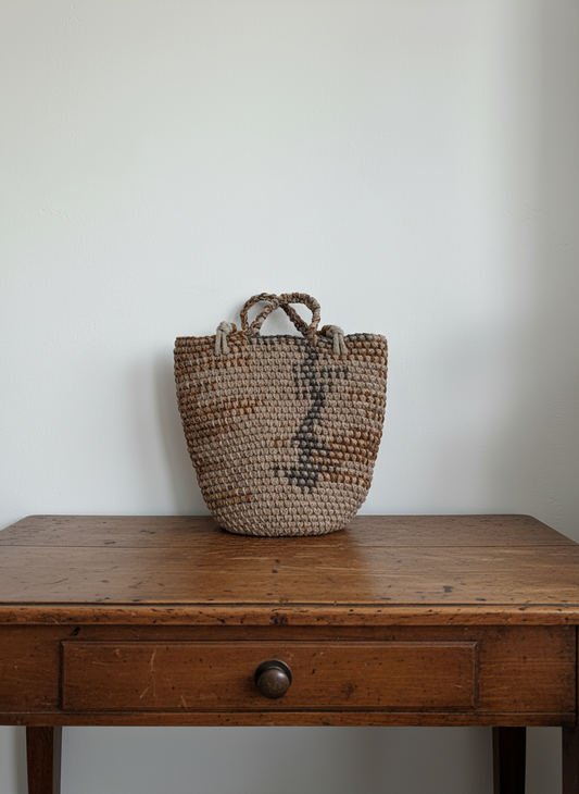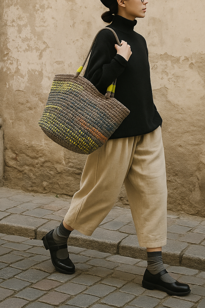 Cada pieza nace de ese recuerdo: está tejida con calma, sin prisa, con fibras naturales como algodón y yute. Ninguna es igual a otra — su forma y color se deciden mientras la hago.