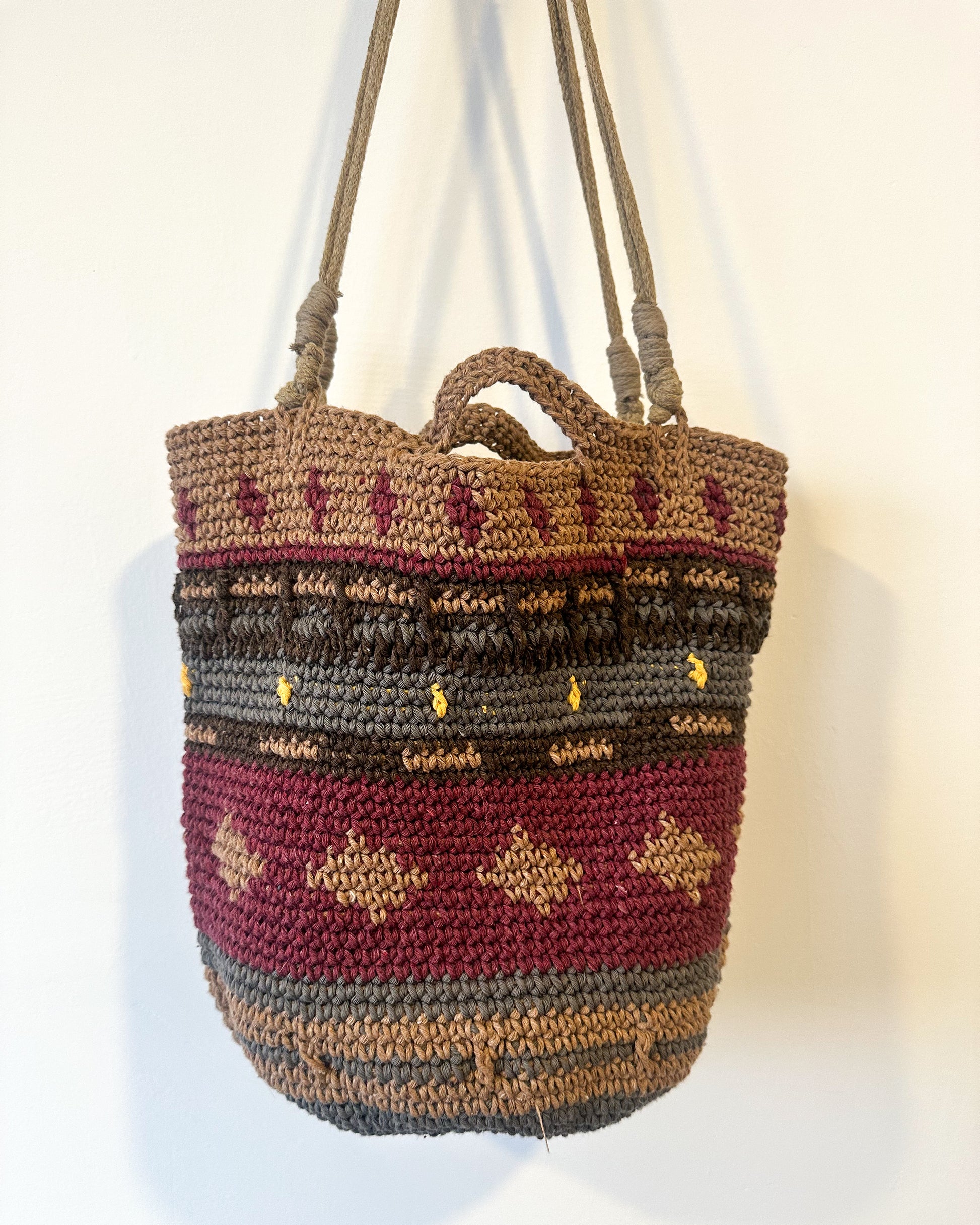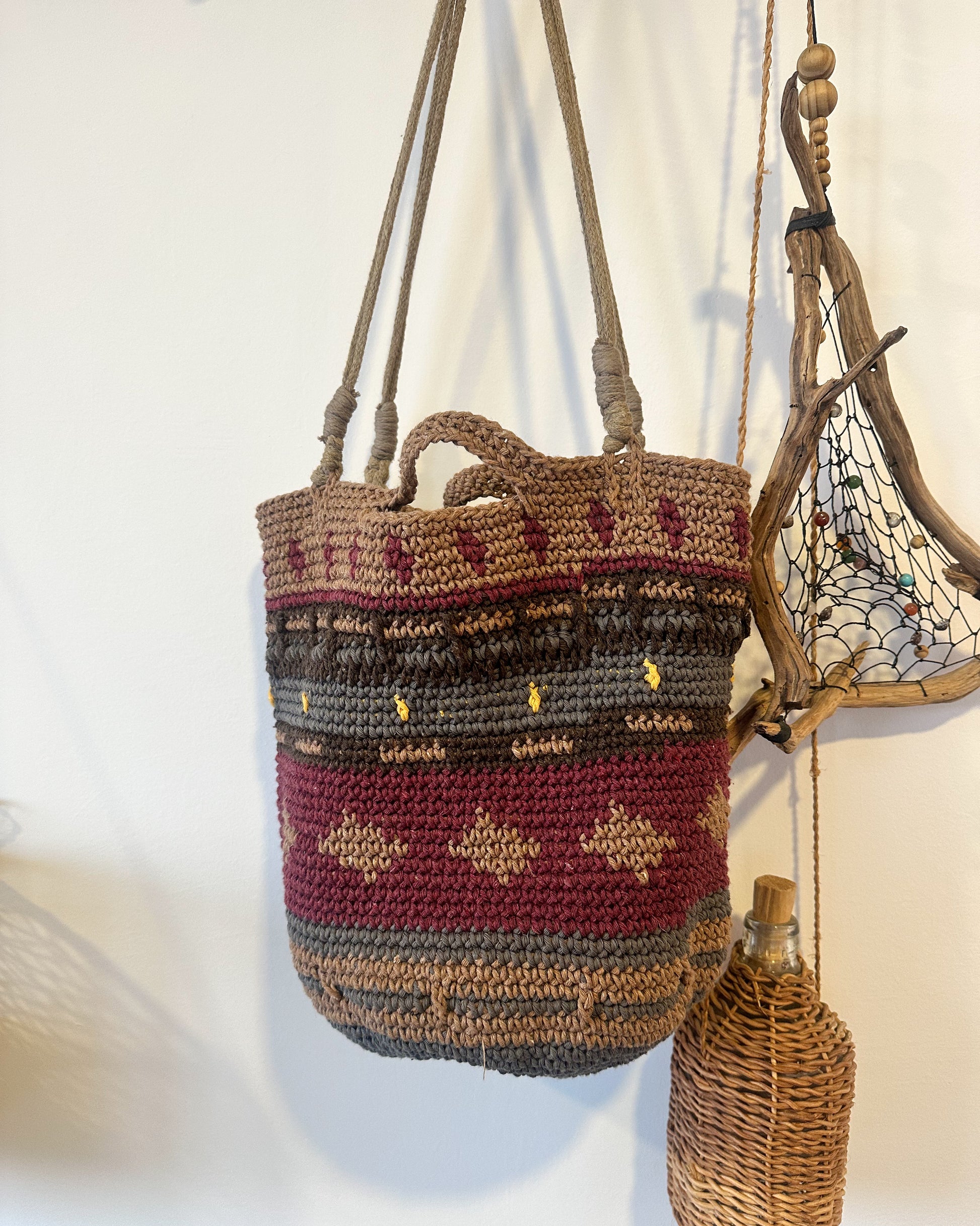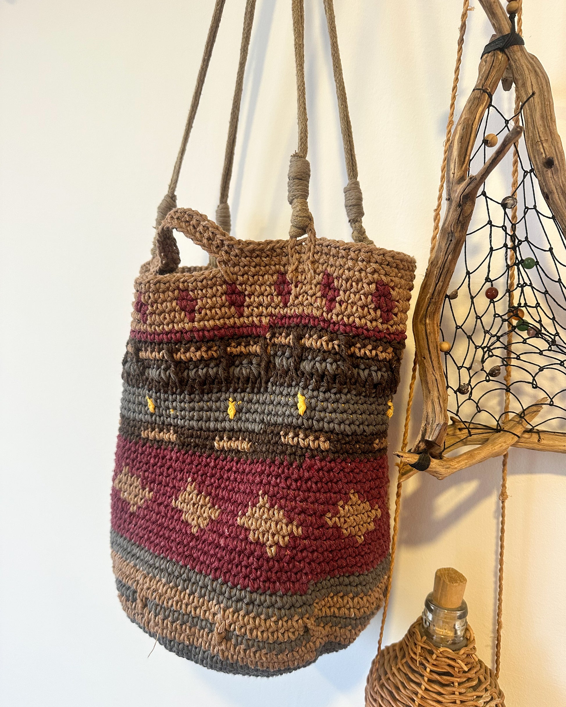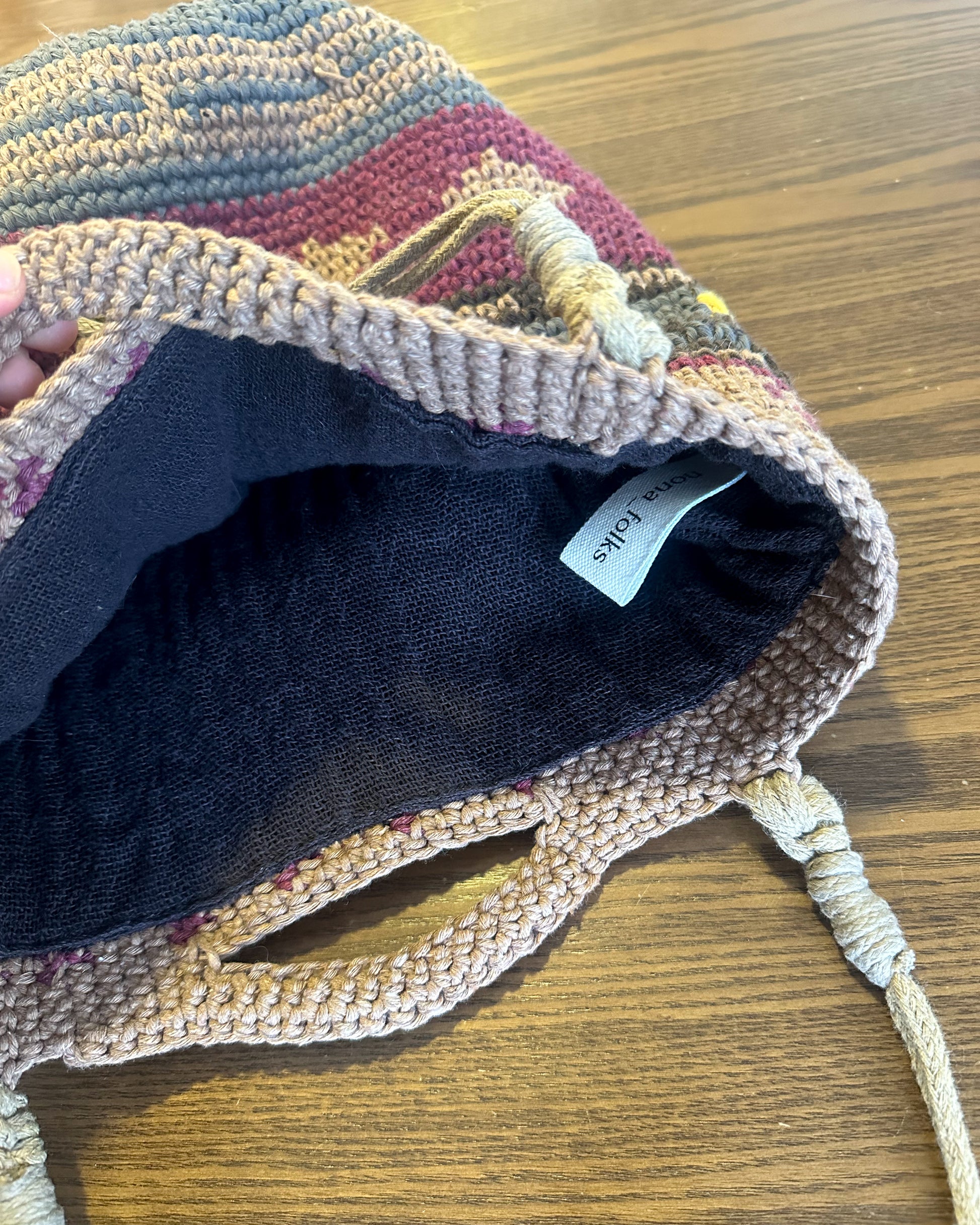 Tejida a mano con hilos de algodón y forro oscuro de yute lavado para mayor confort.